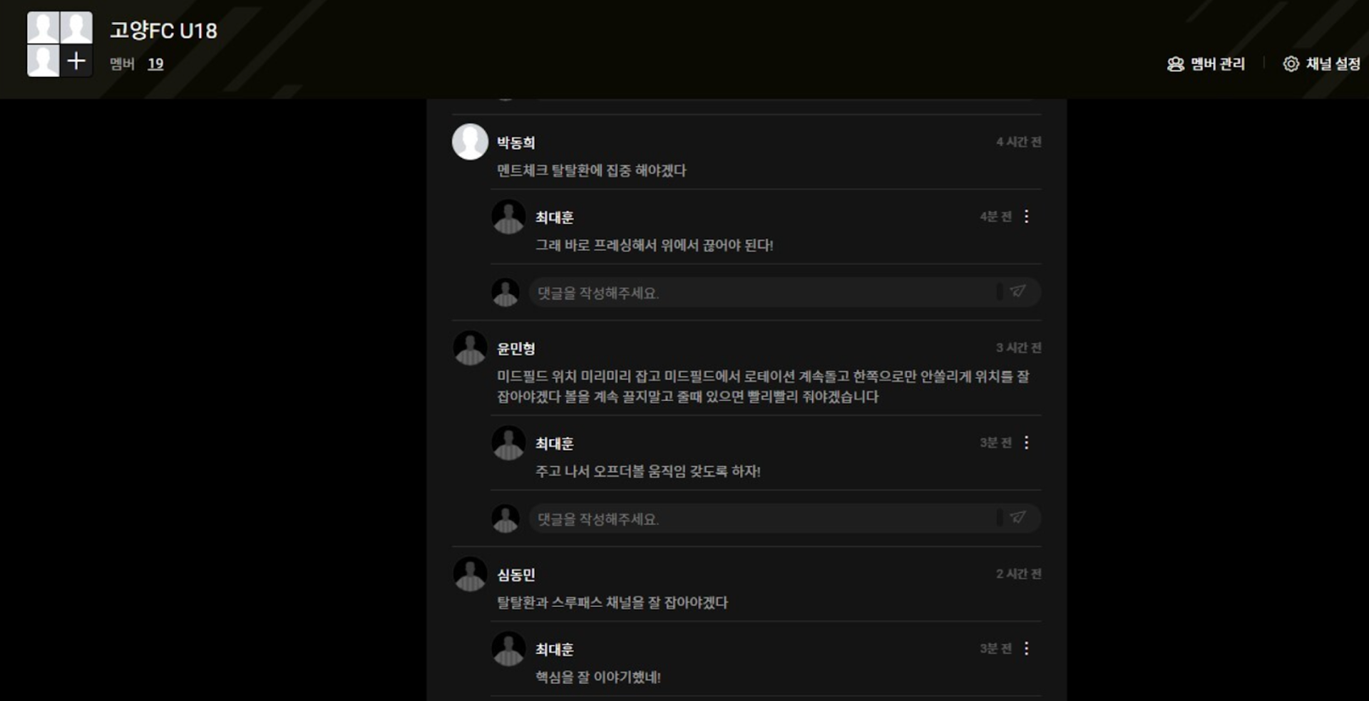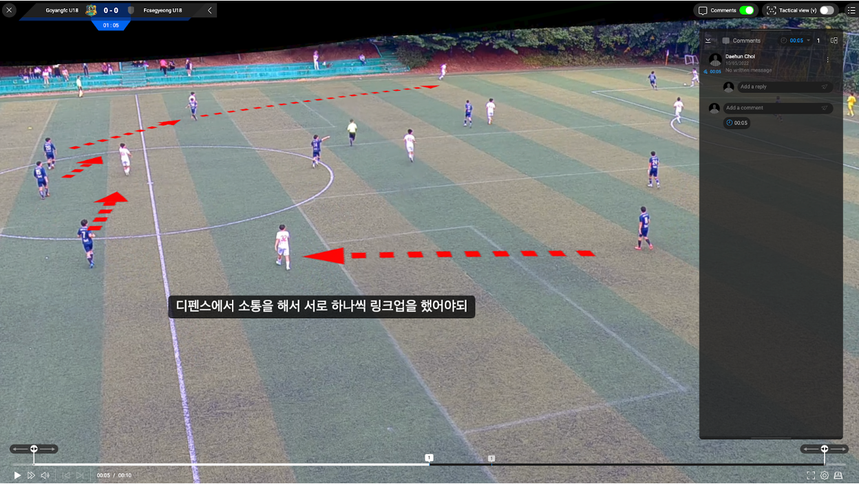 Goyang FC U18 does not hold team meetings like we’d imagine. Instead they’ve replaced it with an online meeting where they watch videos, automatically filmed with a Bepro camera, inside the Bepro messenger. Here they give and receive feedback, review play and watch video of the opponent's play to prepare.
