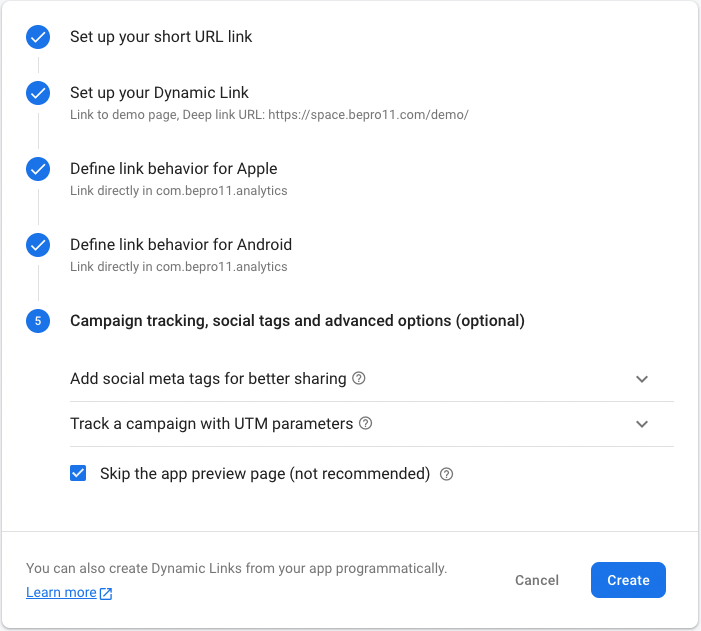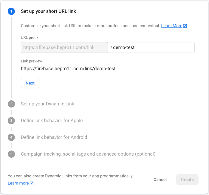 This can be easily completed when following the guide provided by Firebase. Let’s briefly look at the dynamic link creation method under the premise that the app has been added.