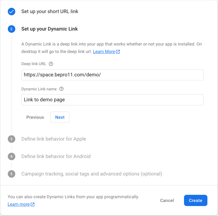 As written in the description, you must list which URL to send the user to when they click on the dynamic link from a desktop. I entered the web demo page (https://space.bepro11.com/demo).