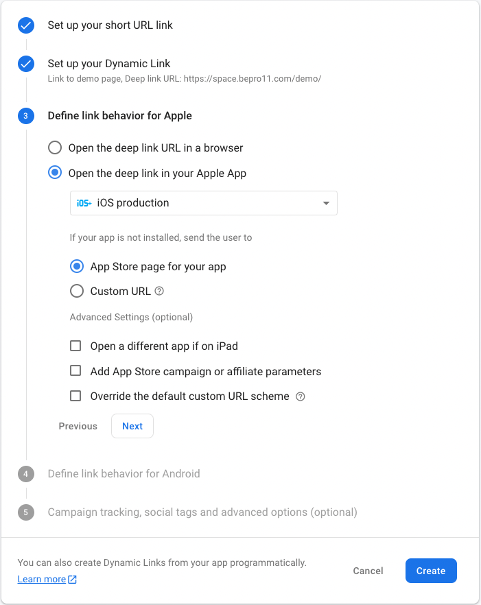 This sets up the process for what happens when the dynamic link is clicked from the iOS app. There is no need for the first option since it opens the browser to send the user to the web demo page set up in step 2, so option 2 was selected. Here, you can select whether to run the production app or the development version app and it is convenient if you made the dynamic link to test from the app in development, as well as the dynamic link to use from the production app. The following is an option to select where to send the user when the app is not installed. You can choose to send the user to the app store for installing the app, but it will be good help for the user to recognise the situation if you place a custom URL by creating a page explaining the process after clicking on the dynamic link.