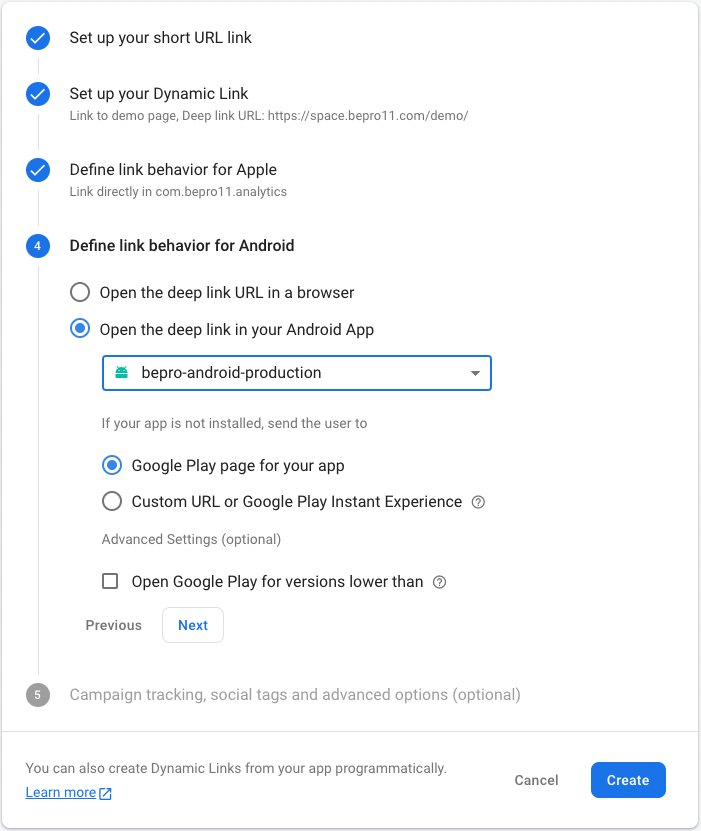 4. Define link behaviour for Android