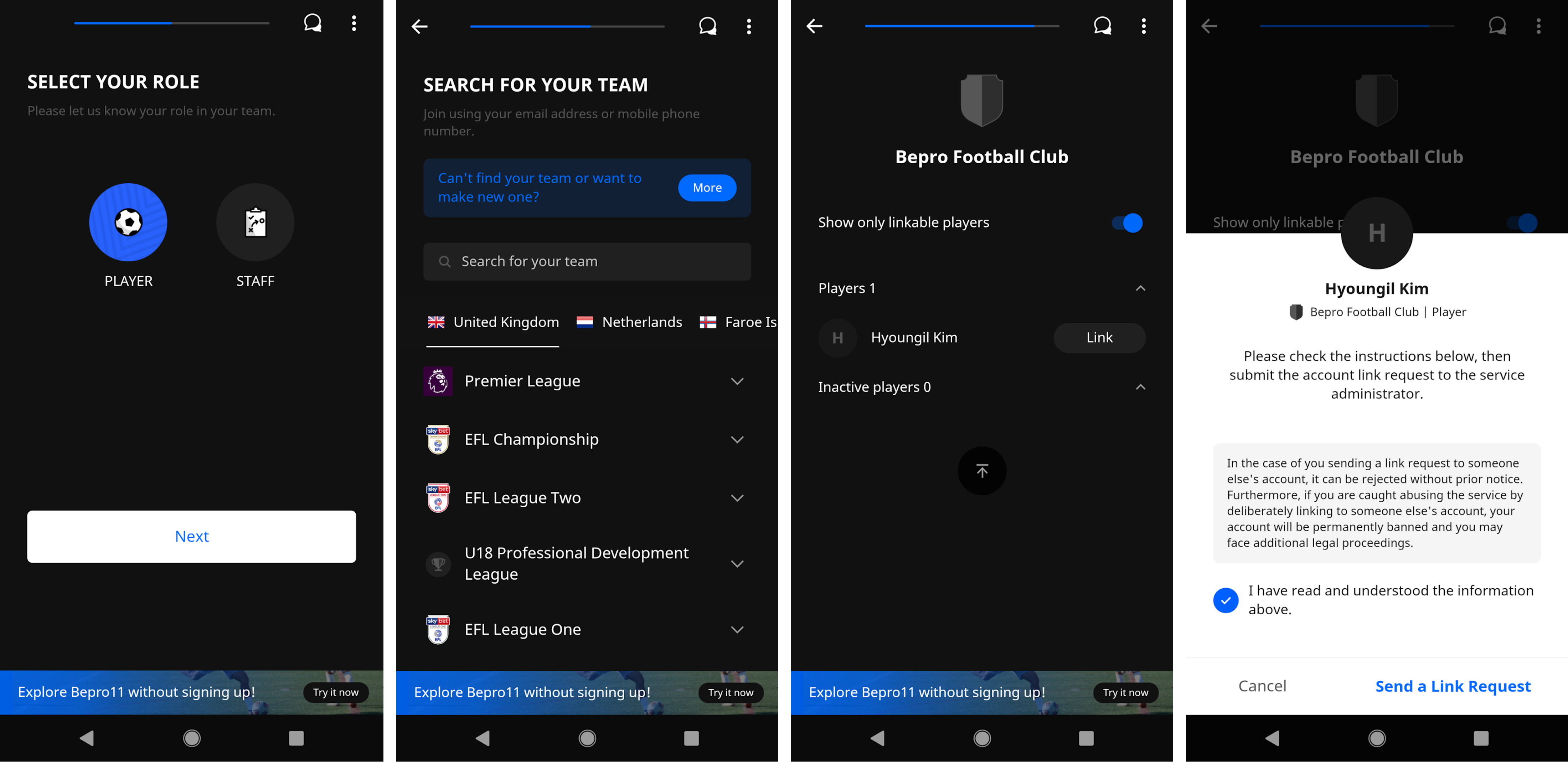 - After selecting their role, the user must find their team under the Country → League list or search by team name.