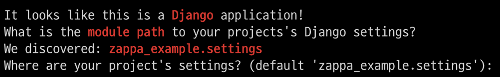 We will go into the interactive mode for Zappa settings. I proceeded with the default values. A thing to note in the middle of the conversation is that Zappa recognised that our directory is a Django project and set it up automatically.