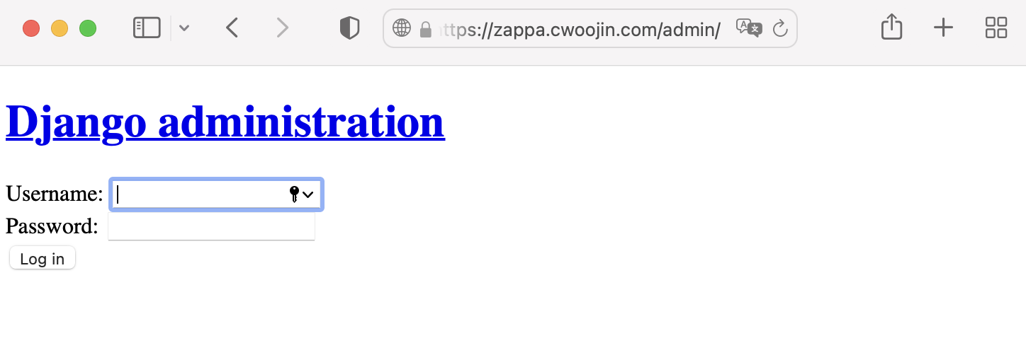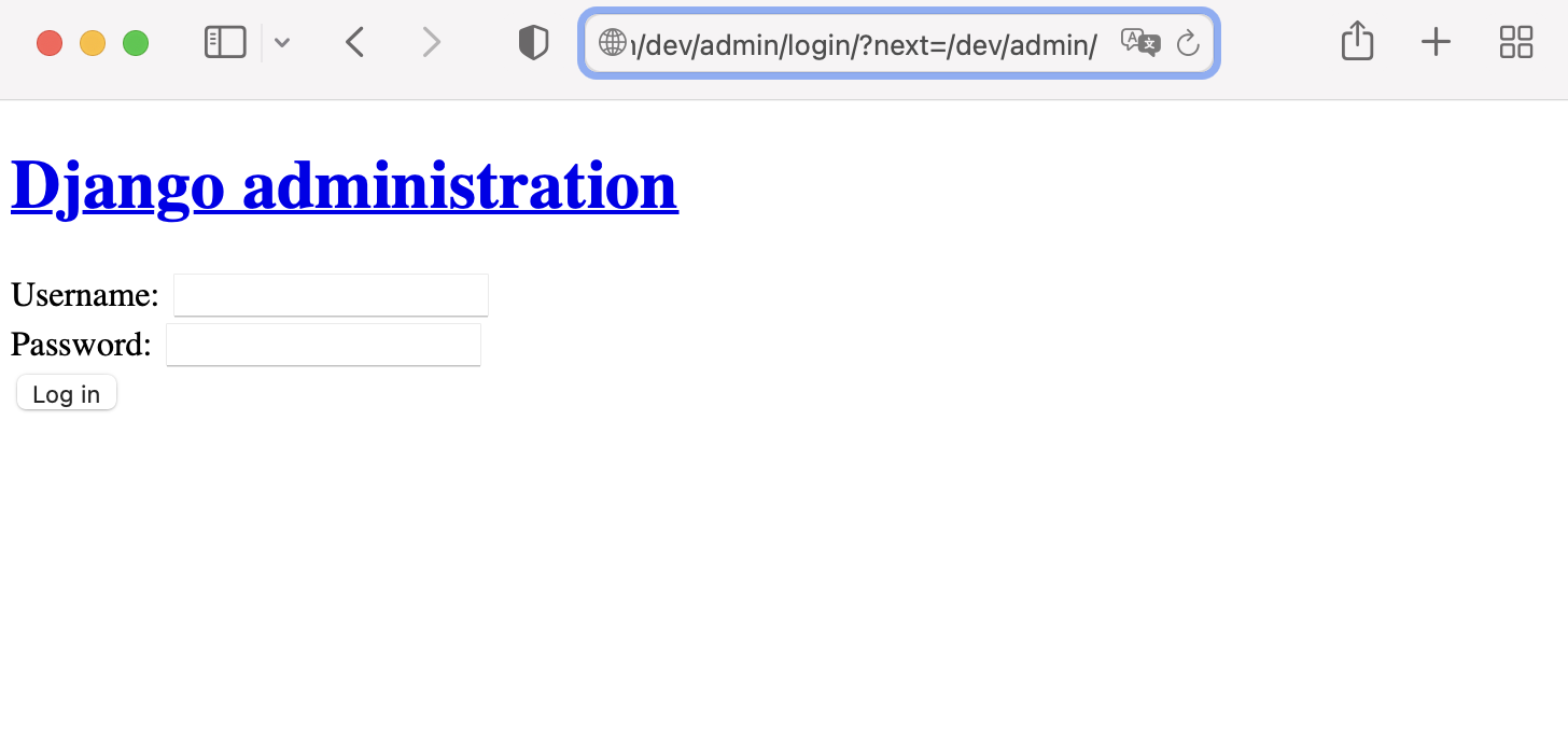 We can check the admin page can be accessed by using the last output url. (Style is not applied because static files are not deployed.)