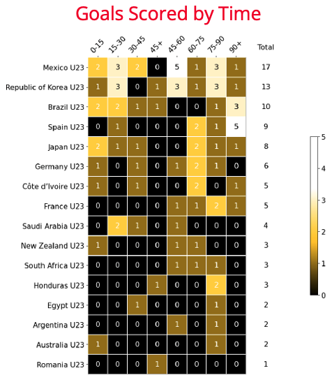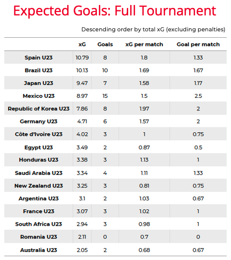 Mexico scored an impressive 15 goals from open play in their six matches. However with a total (non-penalty) tournament Expected Goals (xG) value of 8.97, the Central American side netted almost double the number of goals you would expect based on the quality of chances they had. With Sebastián Córdova, Henry Martín and Alexis Vega sharing 11 goals between them, the Mexicans were taking their chances well, a key factor in their journey to the semi-finals.