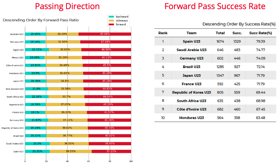 Looking at passing direction also provides context on playing styles. Australia played the highest proportion of their passes forward, although they were outside of the top 10 in terms of completing these passes successfully. Conversely Spain were the happiest to play the ball backwards whilst enjoying the highest forward pass success rate.