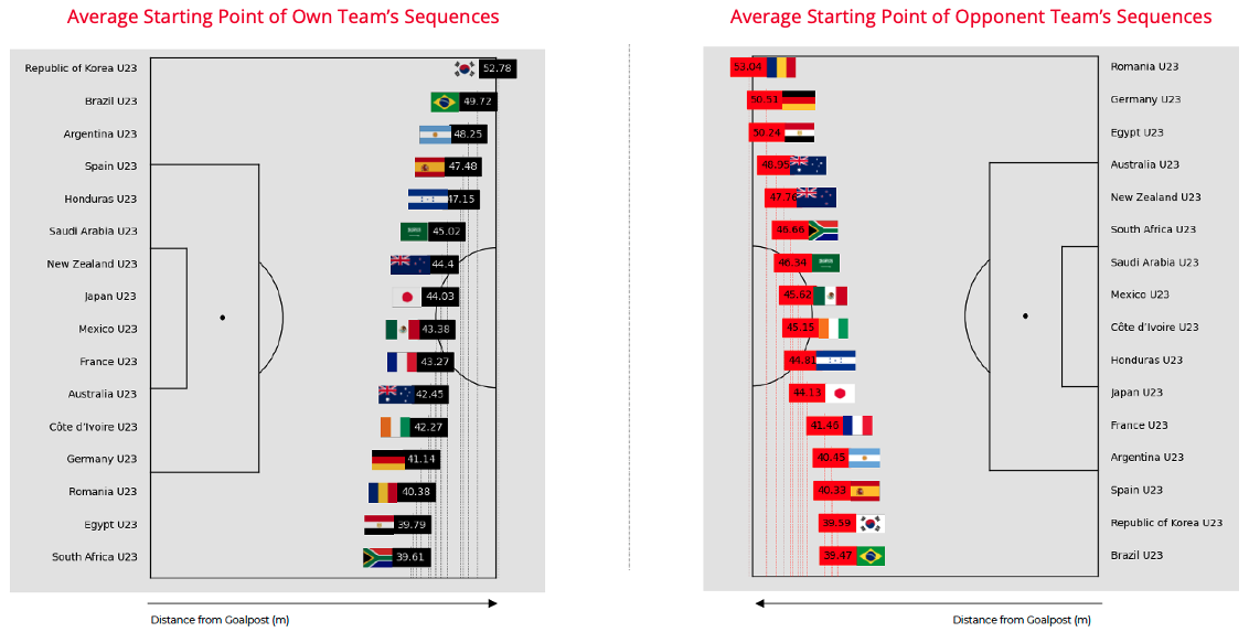 Looking at the average position of where teams started their own sequences and where their opponents started theirs indicates a team’s ability to control areas higher up the pitch. Here we can see South Korea, Brazil, Argentina and Spain leading both with and without the ball.