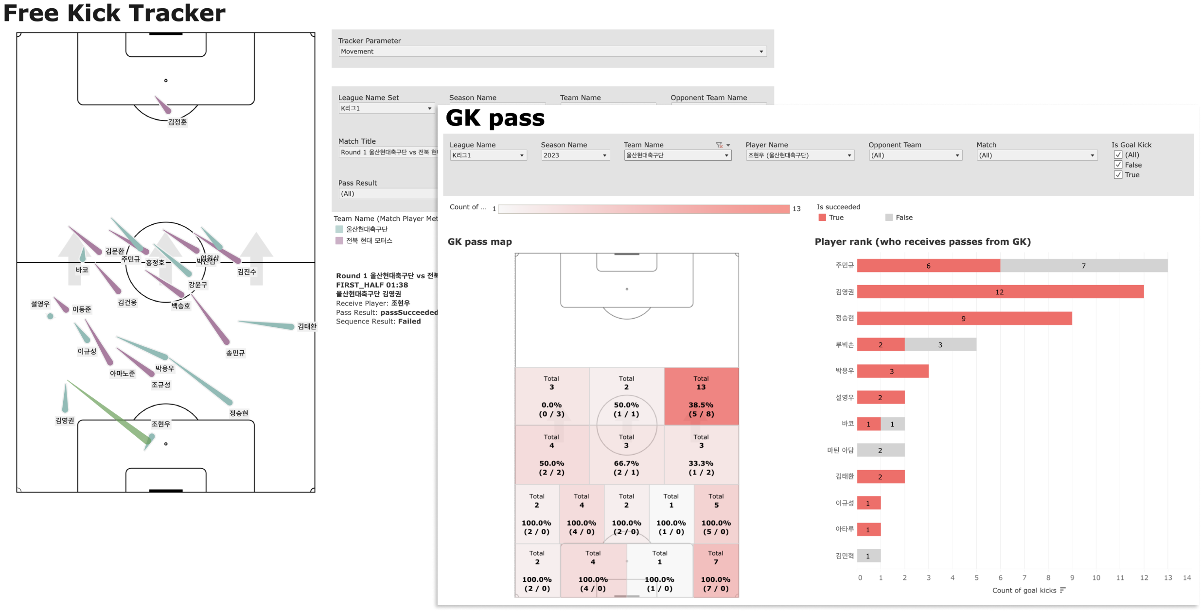 Some of these areas of interest to the club were perhaps not surprising, with reports being built for things like set pieces and shots. Ulsan were also looking to get more insights on some less predictable football topics including goalkeeper passing and turnovers of possession. Through continued consultation, initial reports were built to cover all these areas of interest and developed based on shared feedback. Event and tracking data were used together for some reports, which was made easier since BEPRO provides both data types.