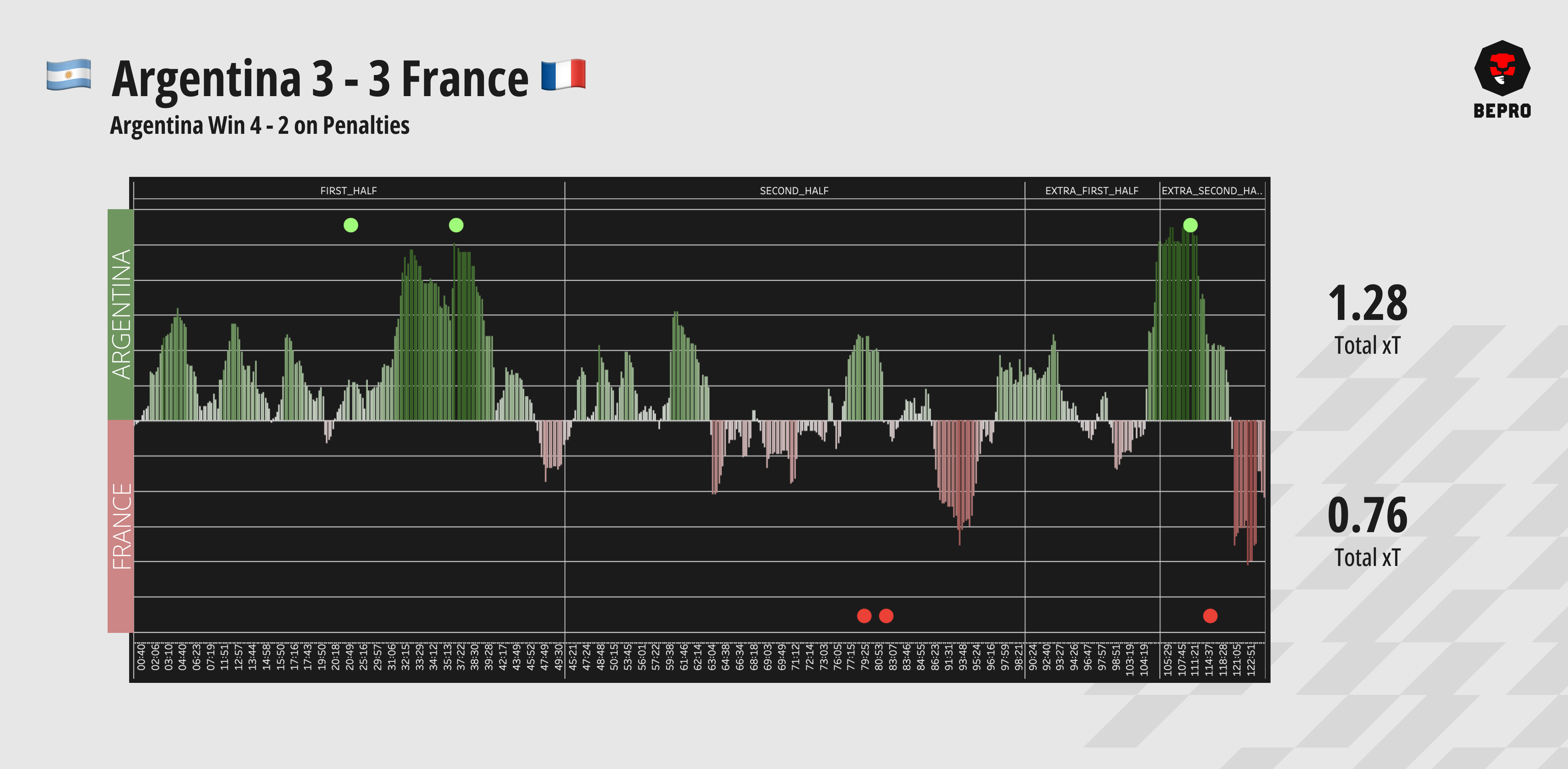 Argentina’s victory over France was hard fought, but they were the more dominant team overall, especially during the first half. The Match Dominance chart below helps us visualise this. The chart is based on Expected Threat, which increases as the ball is moved into dangerous positions (from which a team is more likely to score a goal). Argentina had more of the ball than France (53% vs 47%) and they also had it in more threatening areas of the pitch. France were not helped by not having a shot until the 68th minute!
