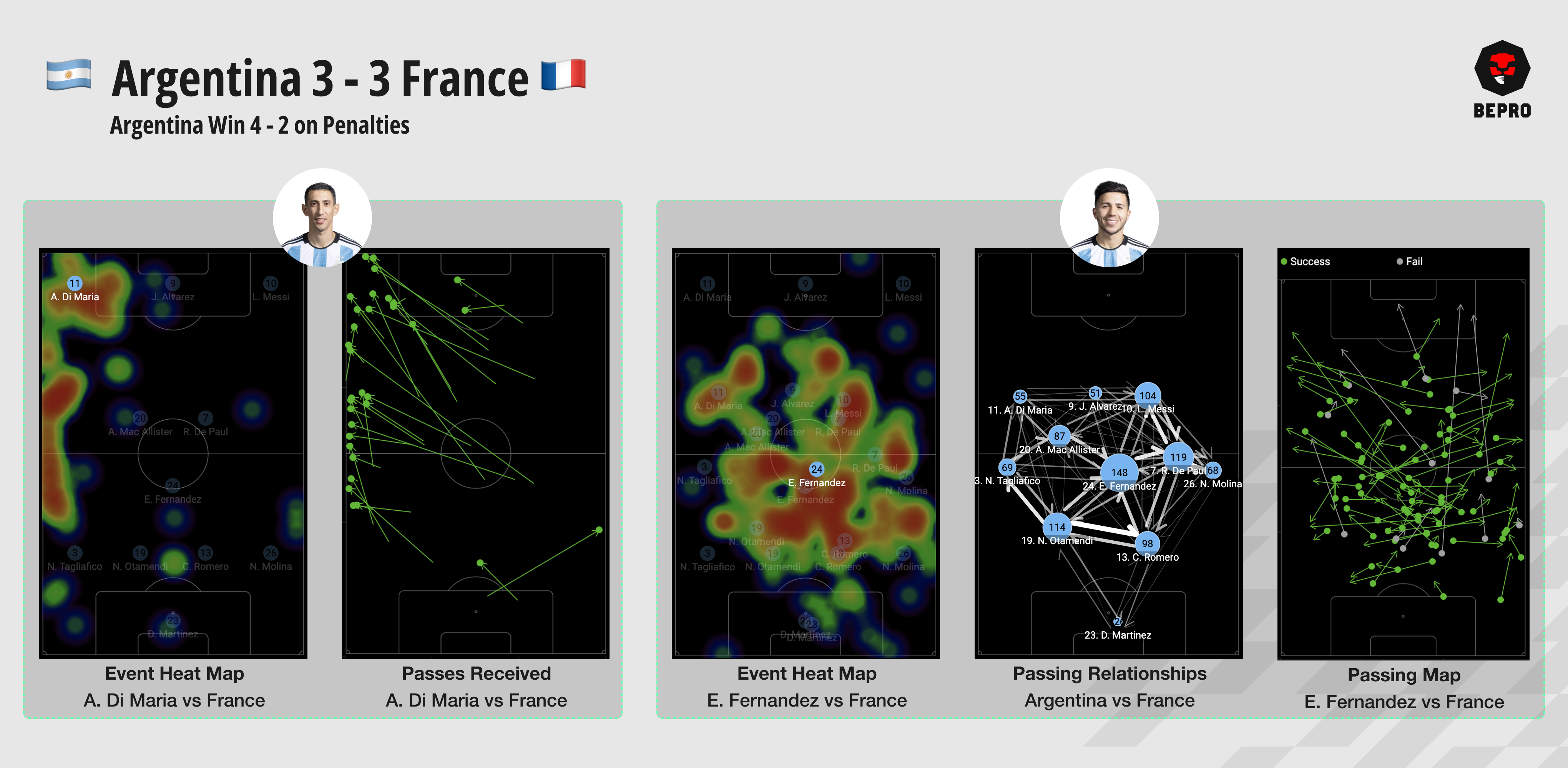Although Messi was the star of the show, his supporting cast were crucial to Argentina’s victory. The scorer of the second goal, Angel Di Maria, caused France real problems as he attacked down the left flank. His team looked for him constantly for the 64 minutes he played, where he provided both a goal and an assist. In central midfield, Enzo Fernandez covered almost every blade of grass as he worked tirelessly with and without the ball. He kept the ball moving as he played and made more passes than anyone else on the pitch (88, 76 successful) and rarely played backwards (9 of 88).