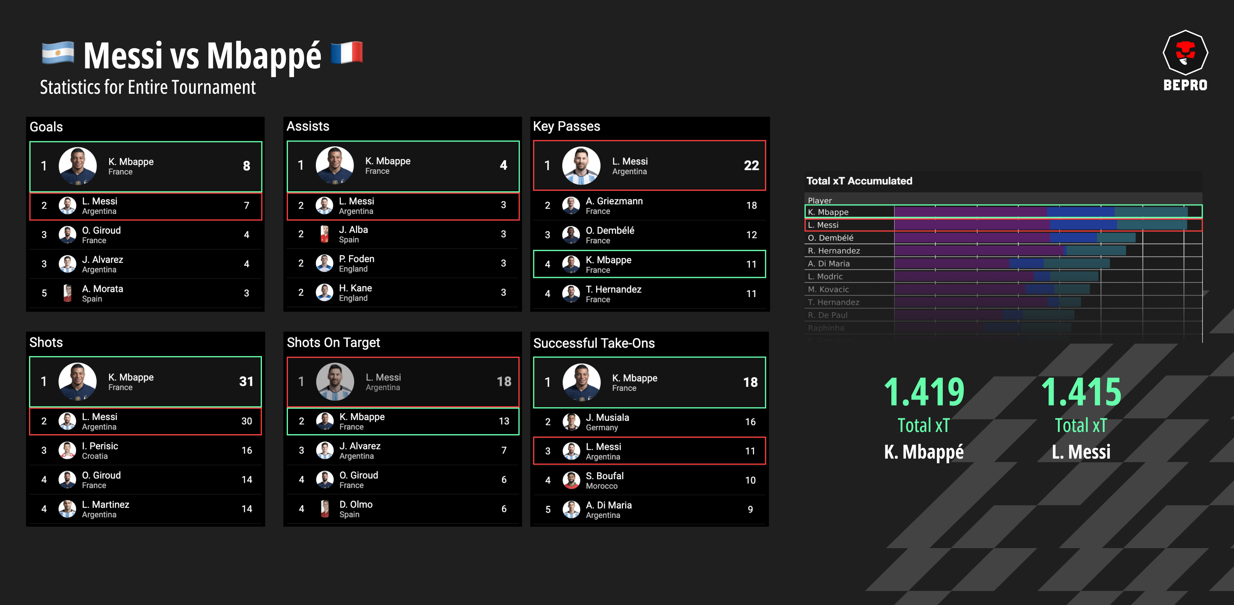 They dominated the attacking stats for the tournament, having the most goals, shots, shots on target, assists, key passes and successful take-ons. As well as scoring themselves, they also sit in the top two places for Expected Threat (for the whole tournament), showing they consistently passed, carried and dribbled the ball into dangerous areas more than anyone else in Qatar.