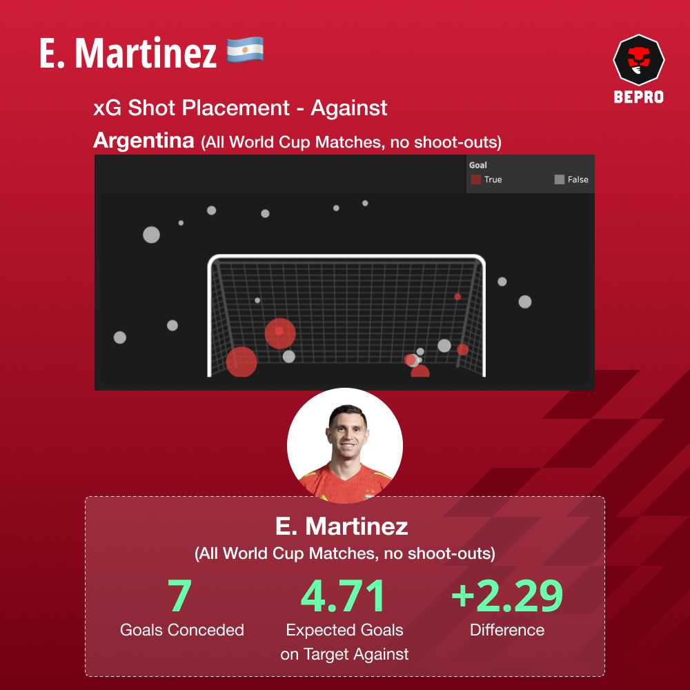 Goalkeeper and Golden Glove winner Emi Martinez was no doubt crucial to the team’s shoot-out victories over the Netherlands and France (saving three of the nine he faced), but in open play he fared less well, conceding seven goals in open play versus an xGOT of 4.71. Penalty saving can be a big advantage in knockout competition, but perhaps Croatia’s Dominik Livakovic can feel unlucky to not have taken the award (see more later).