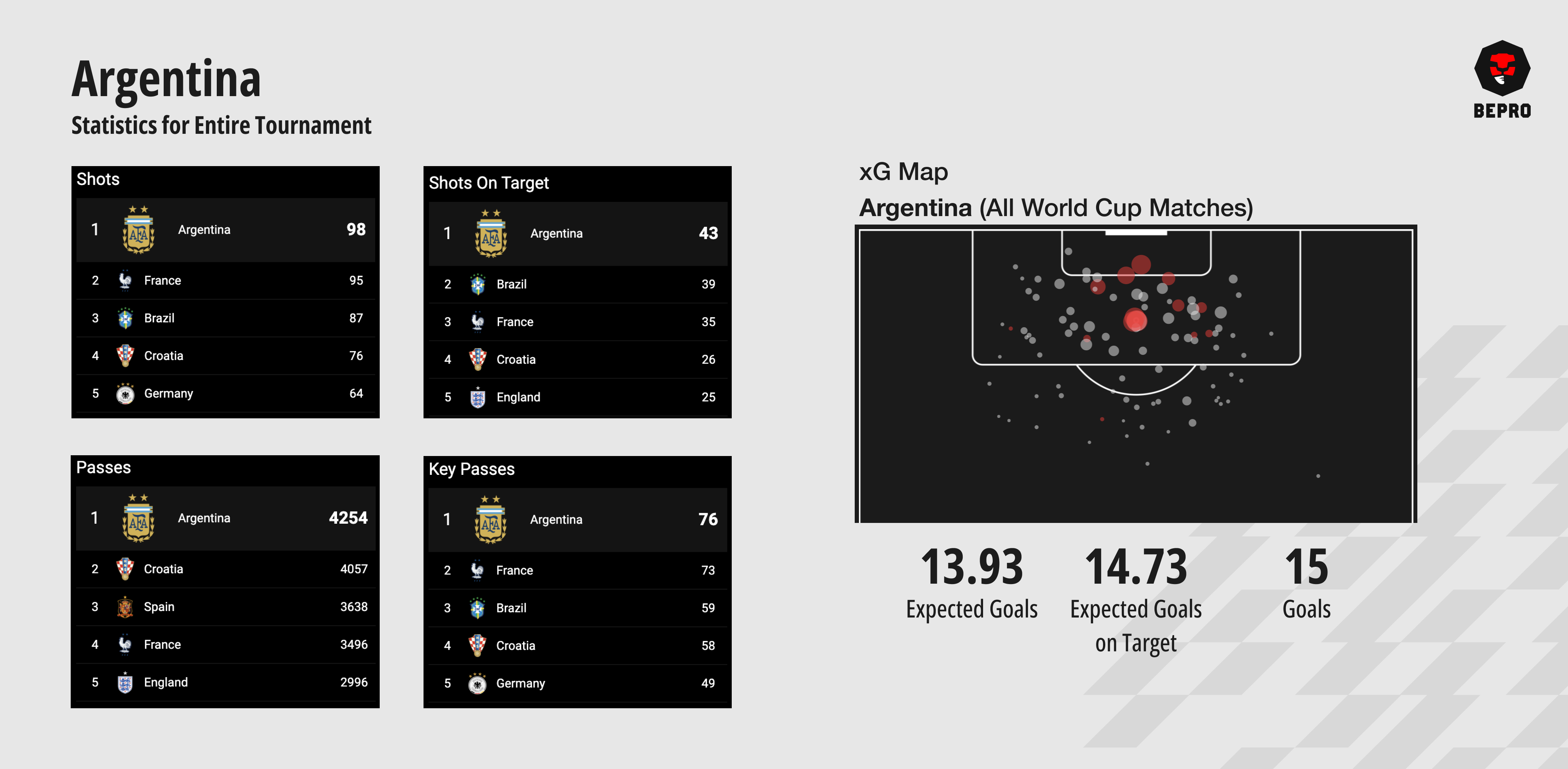 After a surprise loss to Saudi Arabia in their opener (where they were unlucky based on an xG against of 0.18 and an xG for of 2), the South Americans rallied, as shown by some of their tournament stats. They had more passes, key passes, shots and shots on target than anyone else and also generated the highest xG. They used the ball well, putting it in good positions to generate and take goal scoring opportunities.