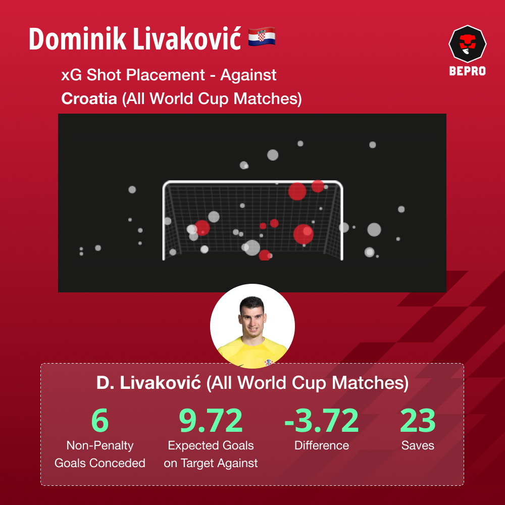 Third-placed Croatia arguably had the best midfield in the tournament (helping the team generate the second highest number of passes and most successful forward passes), but they also had an inspired man in goal. Dominik Livaković conceded six non-penalty goals from an xGOT against of 9.72, meaning he prevented almost four more goals going in than you’d expect.