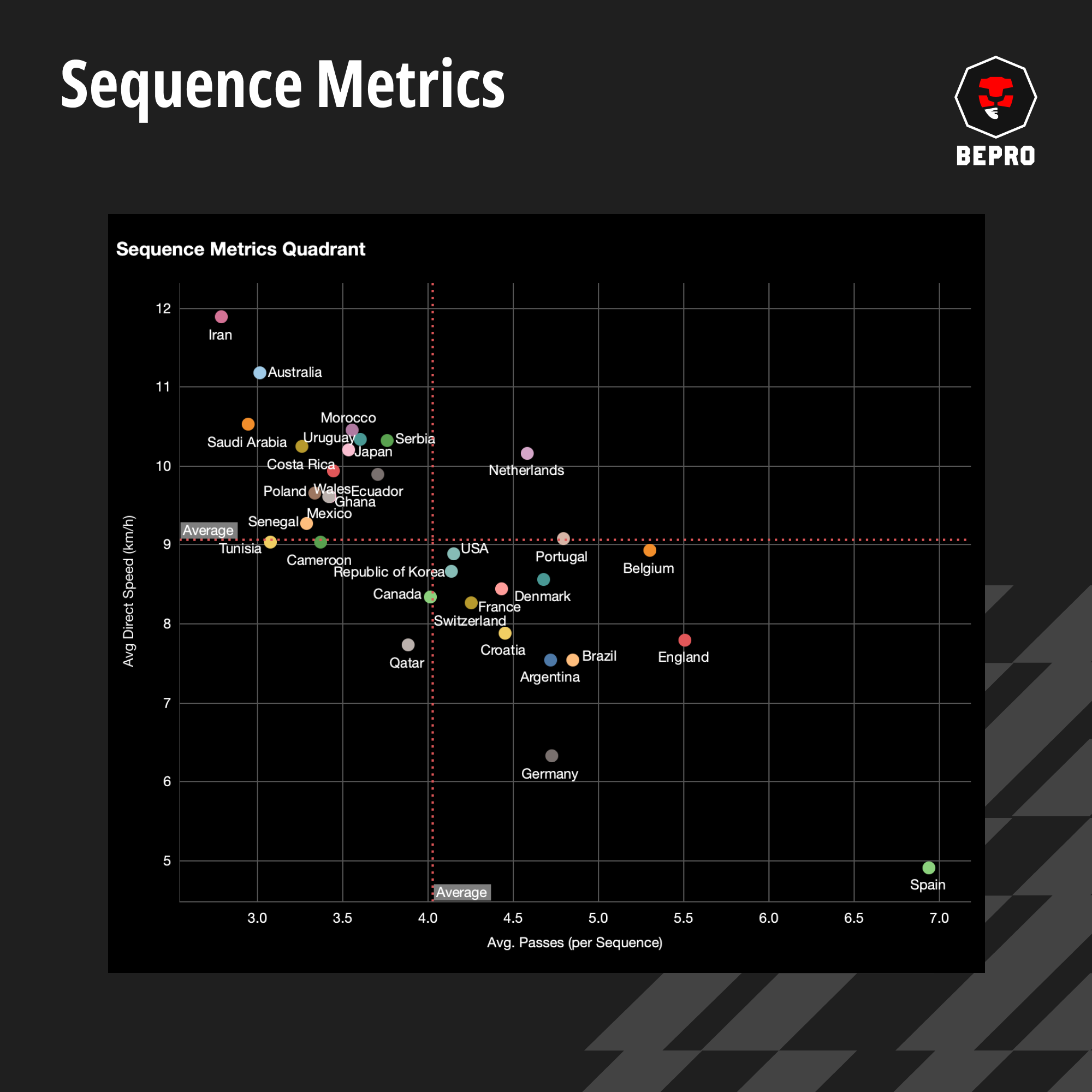 With so many teams playing so many matches, it’s possible to start looking for trends in terms of playing styles and approaches. Sequence metrics are a good way to do this, since they consider how many passes and how quickly a team moves the ball forward, on average, per sequence. When we look at all the teams in the World Cup, we have Spain at one extreme (highest passes, slowest direct speed) and Iran and Australia at the other (fewest passes and highest direct speed). Of the quarter-finalists, six were above average for passes per sequence and below average for direct speed (we will include Portugal since they were only out in terms of direct speed by a tiny margin). The Netherlands were also comfortably above average for number of passes, which leaves Morocco as being the most unique of the final eight sides, as they played in a more direct, counter attacking style compared to the other seven.