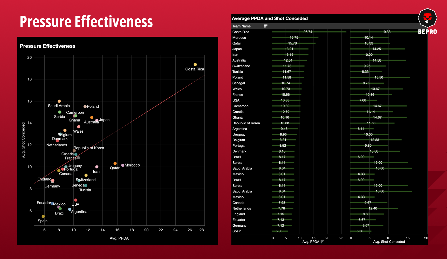 We can also use team-level metrics to measure how effectively teams are pressing their opponents. By counting how many shots a team concedes on average and the number of passes a team allows their opponent to play per defensive action (PPDA), we have a proxy for pressure effectiveness. When we look at these, six of the quarter-finalists are above average, with the Netherlands and Croatia being below average. We can also see that winner Argentina allowed the second fewest average shots of any team. Costa Rica are a real outlier, with their 7-0 loss to Spain in their first group match (where they had 19% possession being a big contribution to this).
