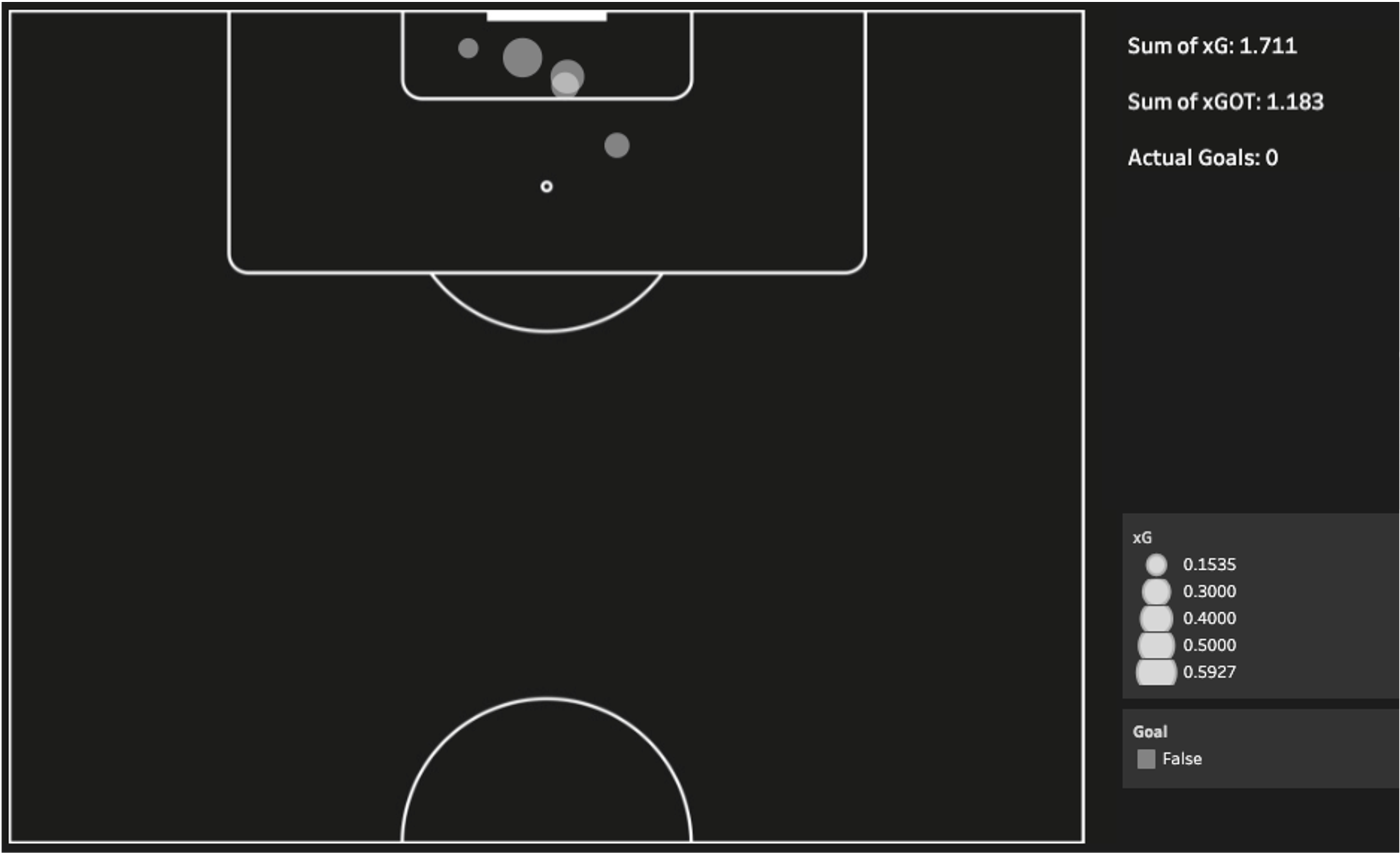 They controlled the first half, as shown by the Match Dominance chart below. This is based on Expected Threat which measures the probability that having the ball at a point on the pitch will lead to a goal. Despite their dominance they were unable to score from open play (their goal came from a penalty converted by Ilkay Gündoğan. They generated goal scoring chances (with an open play xG of 2.273), but were thwarted by a solid goalkeeping performance from Gonda and ineffective finishing.