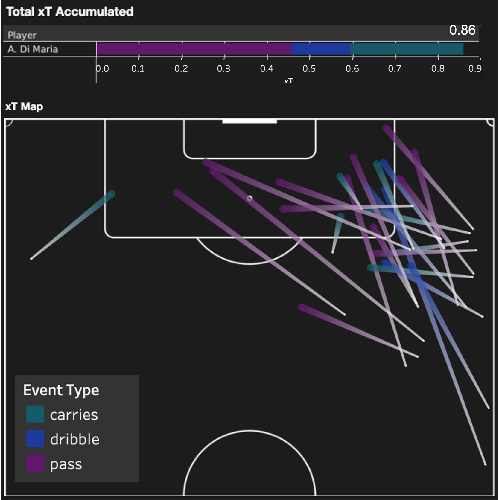 Returning to Australia, they will come up against Argentina, who have the individual player who has generated the highest Expected Threat (xT) during the group stages in the form of Angel Di Maria. He’s generated 0.86 xT, demonstrating his ability to still create and put the ball in dangerous areas. His xT map for the World Cup group stages shows how his ability to cut in from the right, using his dominant left foot, is causing opponents real problems.